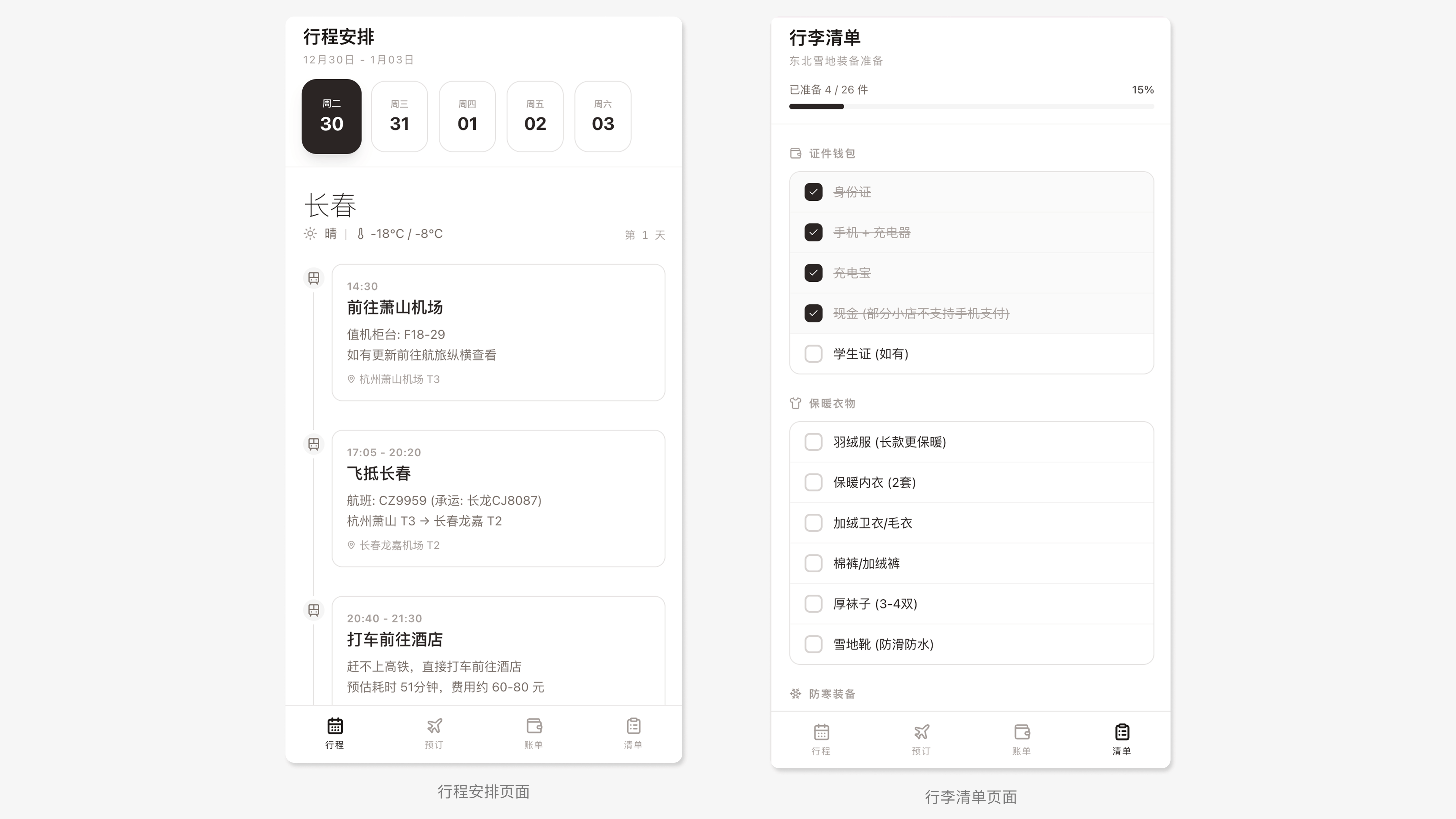 - Context-Aware: 它不是一个死板的时间表,而是你的智能助理。首页时间线会自动定位到"当日"与"当前"行程。接入和风天气(QWeather API),根据当前所在的城市(如长春、延吉)动态展示实时气温,提醒是否需要增添衣物。